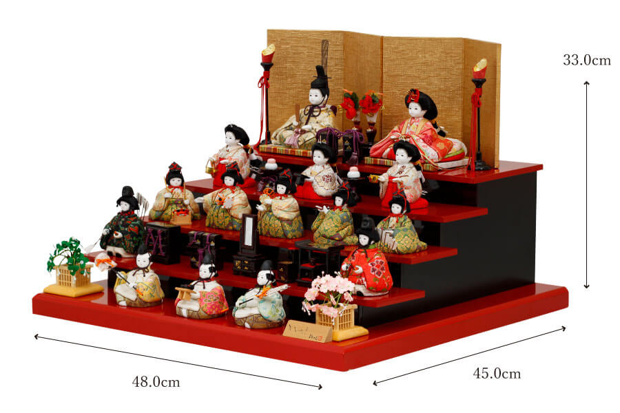 お内裏様とお雛様をはじめ、三人官女・五人囃子・随身・仕丁まで揃った本格仕様で、ひな祭りの伝統美を存分にお楽しみいただけます。
