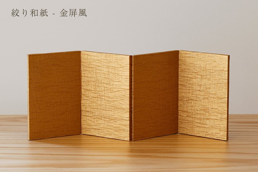 絞り和紙金屏風:木の板に和紙を張り合わせ丁寧に仕上げました。 ひな祭りの歌にも登場する定番の金屏風は、お雛様をより華やかに、より煌びやかに演出します。 - お道具