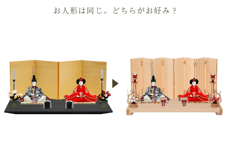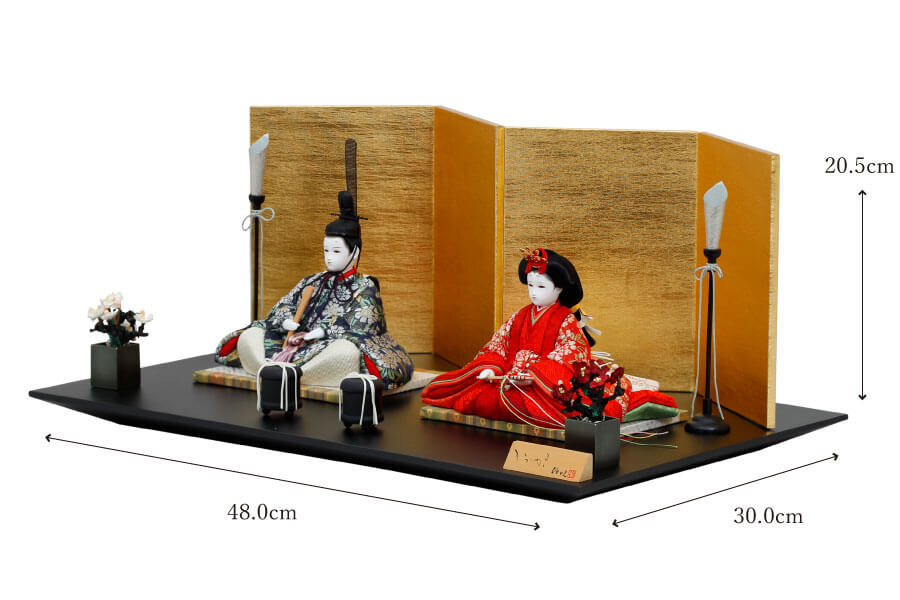 高級感を漂わせる会津塗り・マットブラックの飾り台に、気品あふれる親王飾りを組み合わせました。