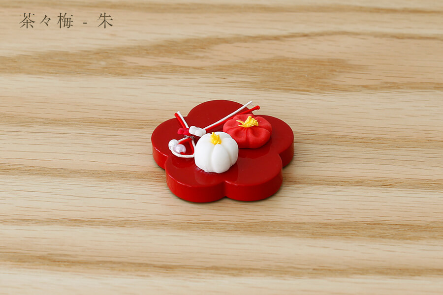 茶々梅 朱:梅の花に可愛らしいお菓子をのせた前飾りです。紅白の水引きが桃の節句に花を添えます。 - お花