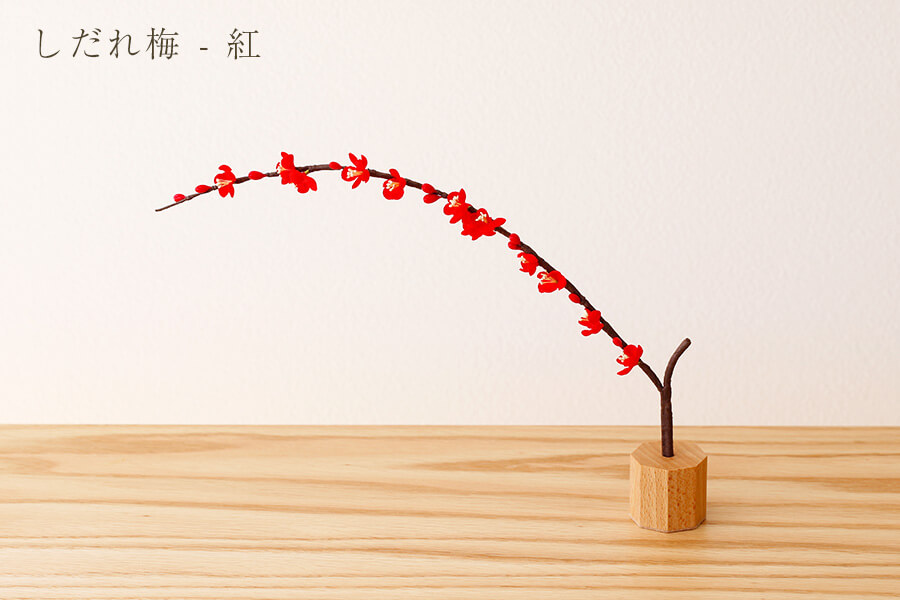 台座は柔らかな曲線を描くマット白のデザインで、シンプルながら上質な印象。枝垂れる紅梅の飾りが空間にリズムを生み、コンパクトながらも目を惹く存在感を放ちます。