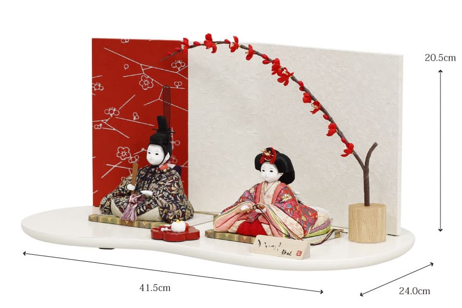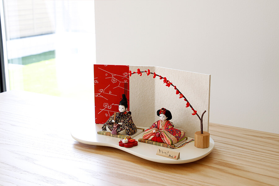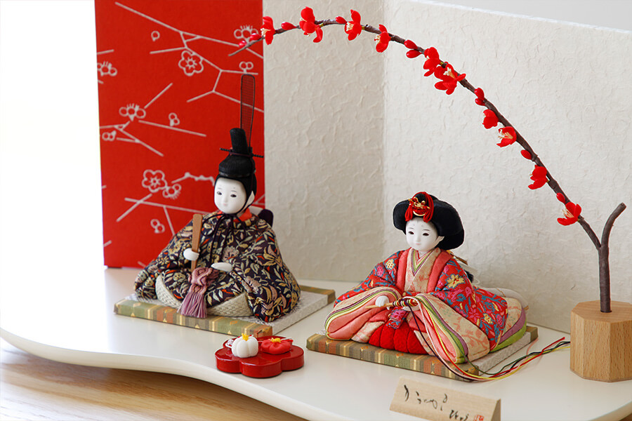 背景の屏風には梅の花をあしらった赤と白のデザインが施され、春の訪れを感じさせる華やぎを添えます。