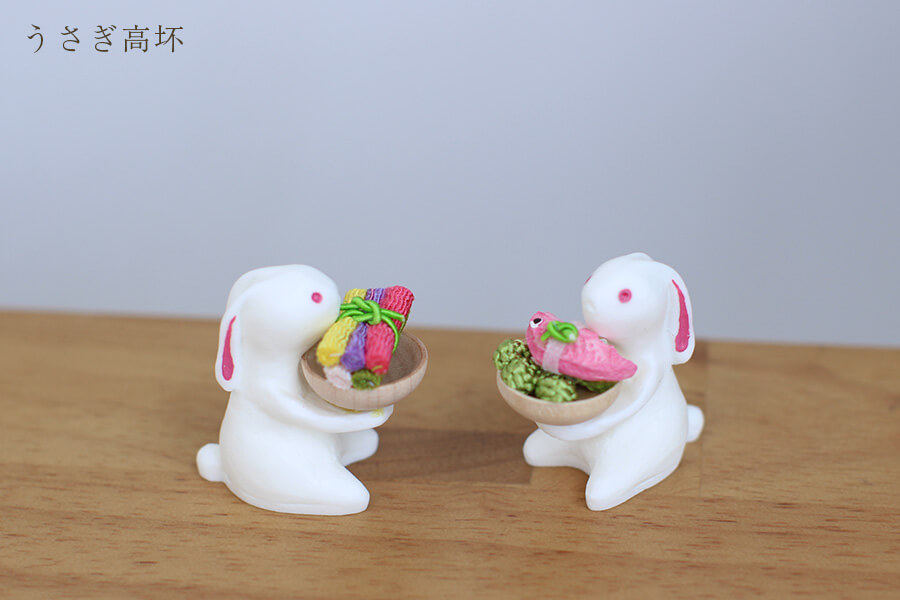 うさぎ高坏:様々なお供え物を携えた可愛らしいうさぎ。ぴょんぴょん飛び跳ねるうさぎは、飛躍や成長、発展を意味する縁起物です。