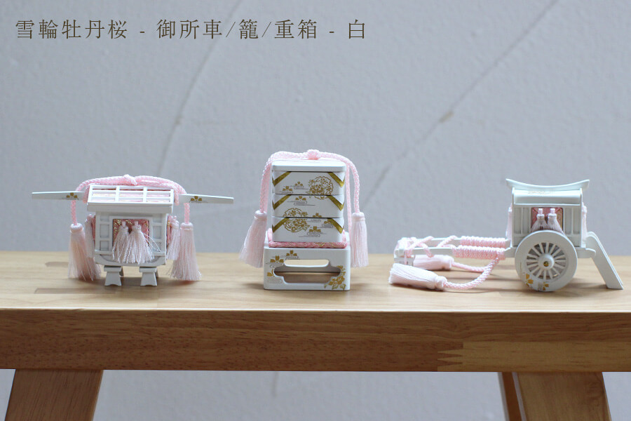 雪輪牡丹桜 御所車・籠・重箱 白:婚礼の行列に使われる御所車や籠は、高貴な人々を運ぶための乗り物、食べ物を入れる重箱は、嫁入り道具として用意されました。 お道具と同じ雪輪牡丹桜文様を施したミニチュアは豪華絢爛な婚礼行列が目に浮かぶようです。 - お花