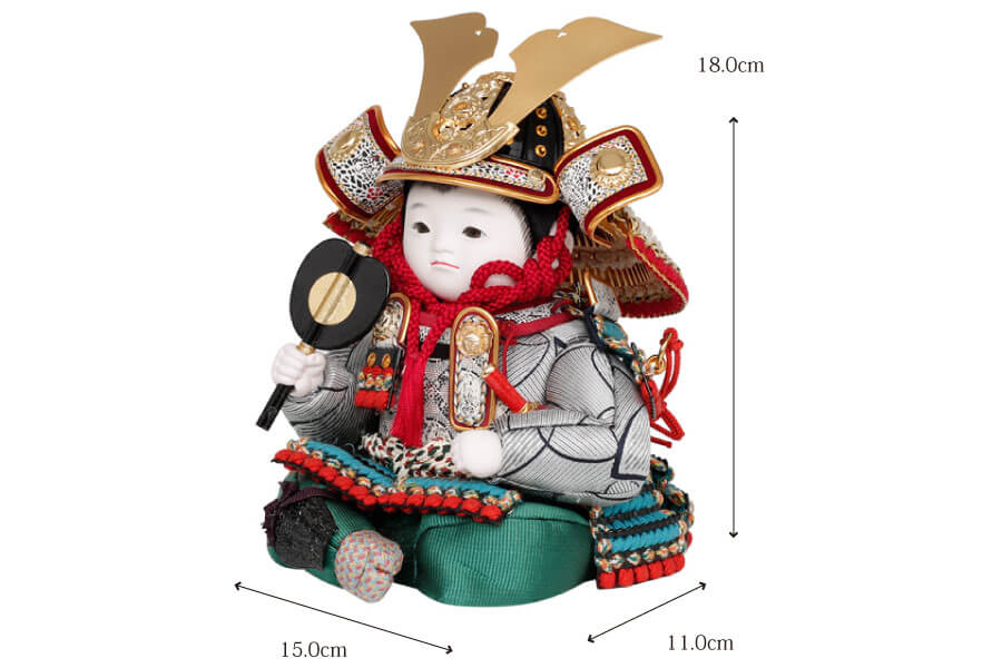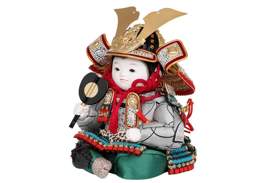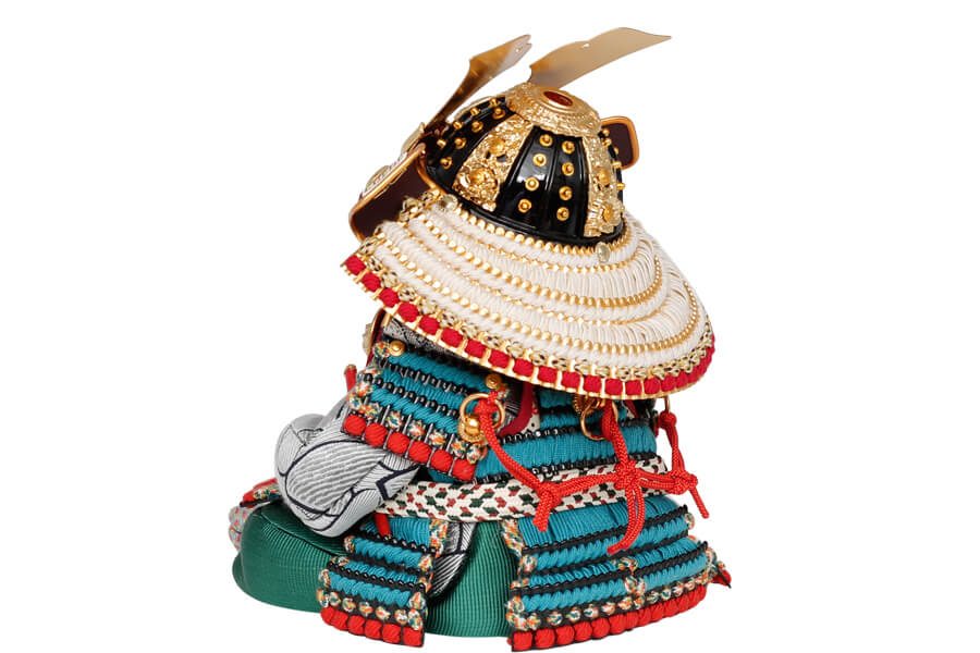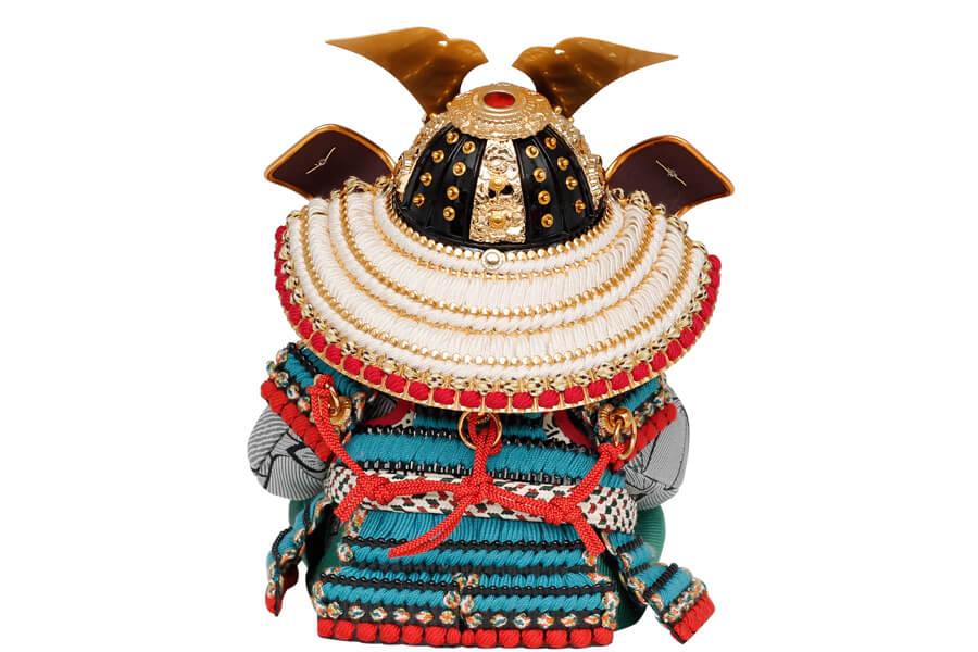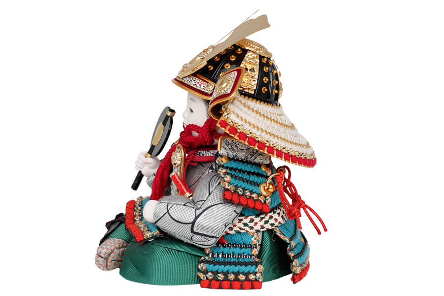 人気の高い浅葱糸威の甲冑を身に着けた童武者人形。愛らしくも勇ましい表情の小さな武者が晴れの日をお祝いします。