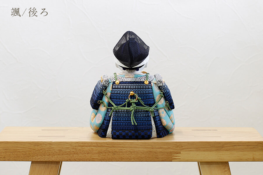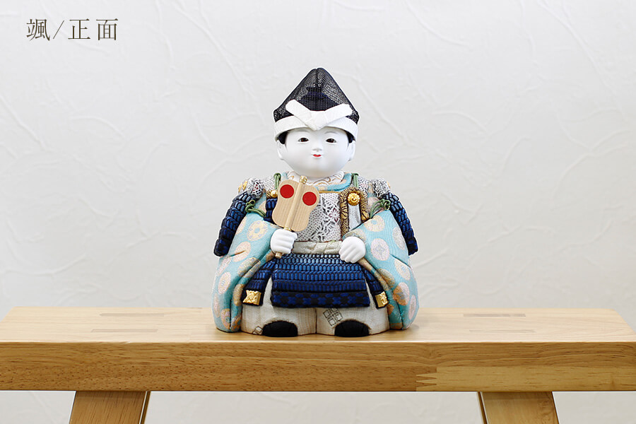 正絹ならではの味わい深いお色目の衣裳が自慢の作品です。椅子に腰かけているデザインで爽やかな五月の空をイメージした鎧がかわいい。