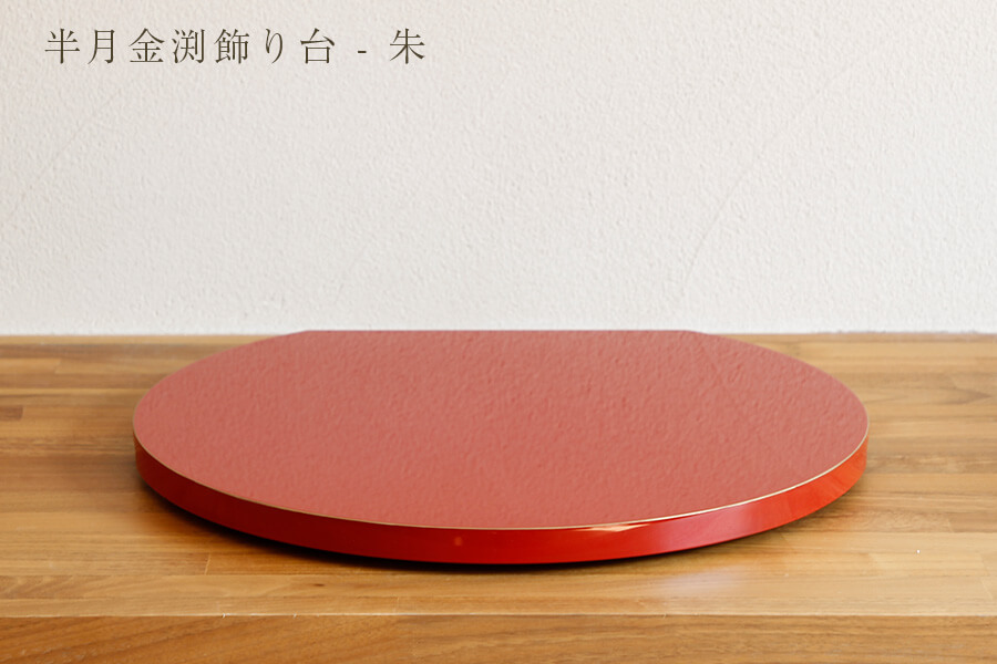 半月飾り台 金縁:魔よけの色として知られる朱色の飾り台。円形に沿って施された金色の縁取りは、会津の漆器職人の手によってひとつひとつ筆で描かれています。 - 屏風