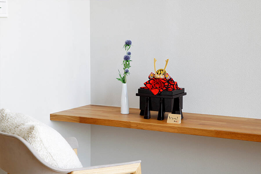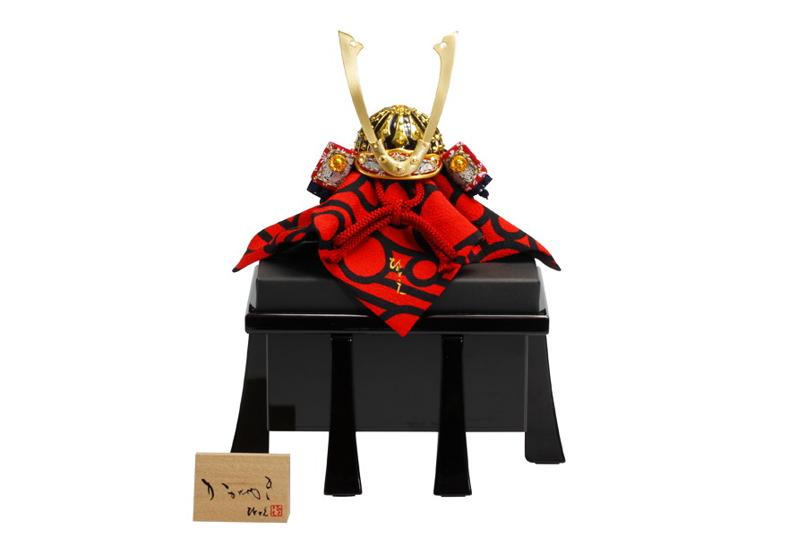 コンパクトサイズながら精巧なつくりが人気のひととえオリジナル兜、「元 - げん -」。魔除けの色である赤糸威の兜を、お櫃と一緒にシンプルかつコンパクトに飾ります。