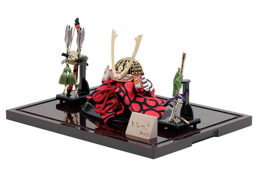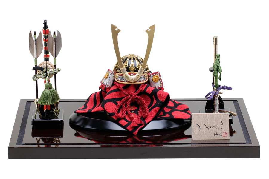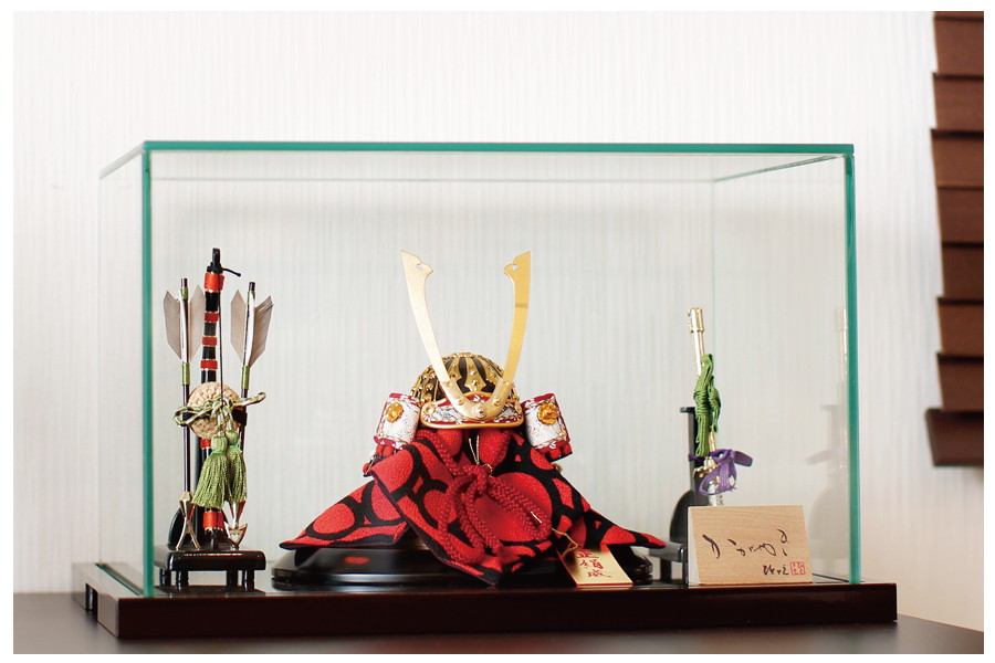 ガラスケースと弓、太刀が兜を最大限に引き立てるこちらの商品は毎年好評をいただいております。