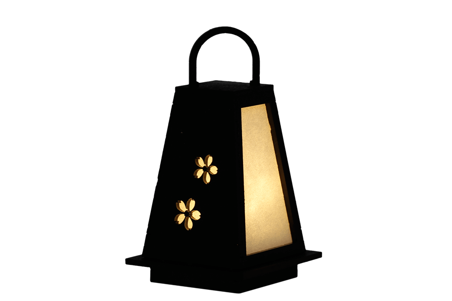 お雛様に合わせたコンパクトなサイズで、アクセント飾りとしてひとつ、殿と姫の脇にひとつずつ、などアレンジも楽しめます。 小さなかわいいサイズですがボタン電池式で明かりを灯すことができ、側面の桜がやさしくお雛様を照らします。