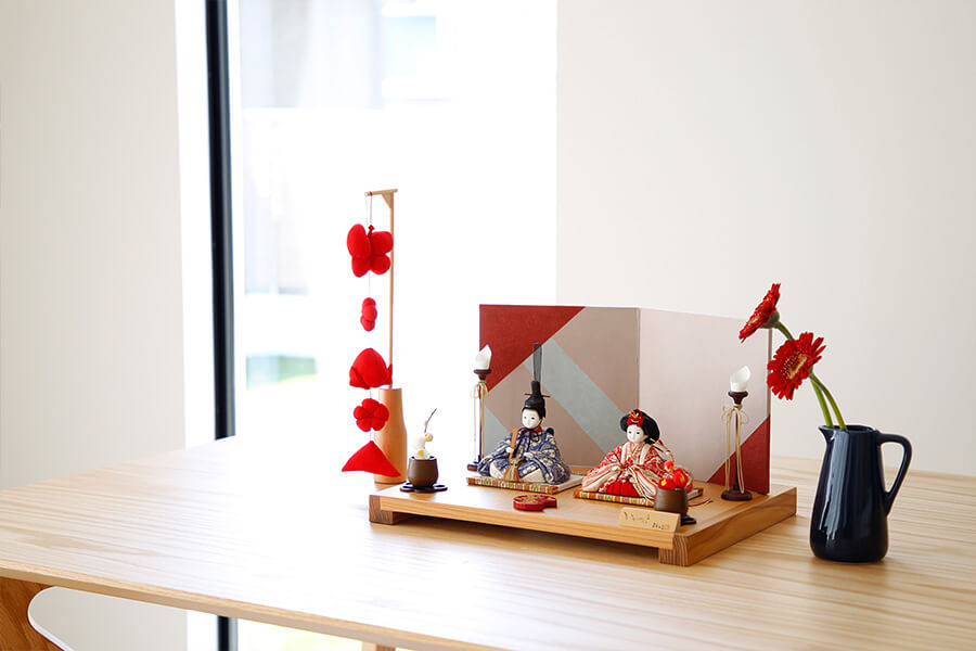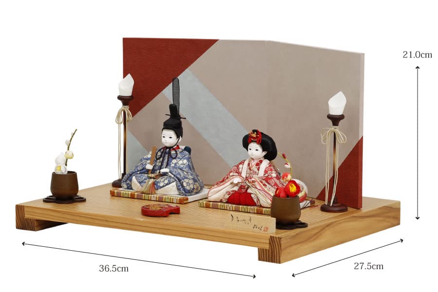 伝統美とモダンデザインを融合させた、洗練された雛人形セットです。 シンプルな幾何学模様の屏風を背景に、深みのある青を纏う男雛と、鮮やかな紅を纏う女雛が寄り添い、凛とした存在感を放ちます。