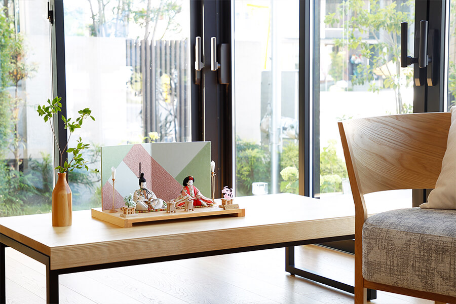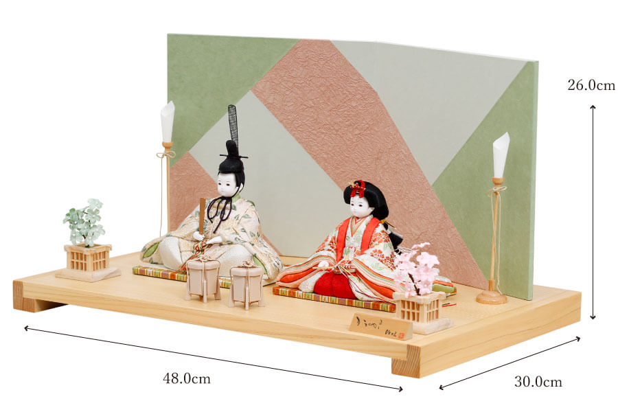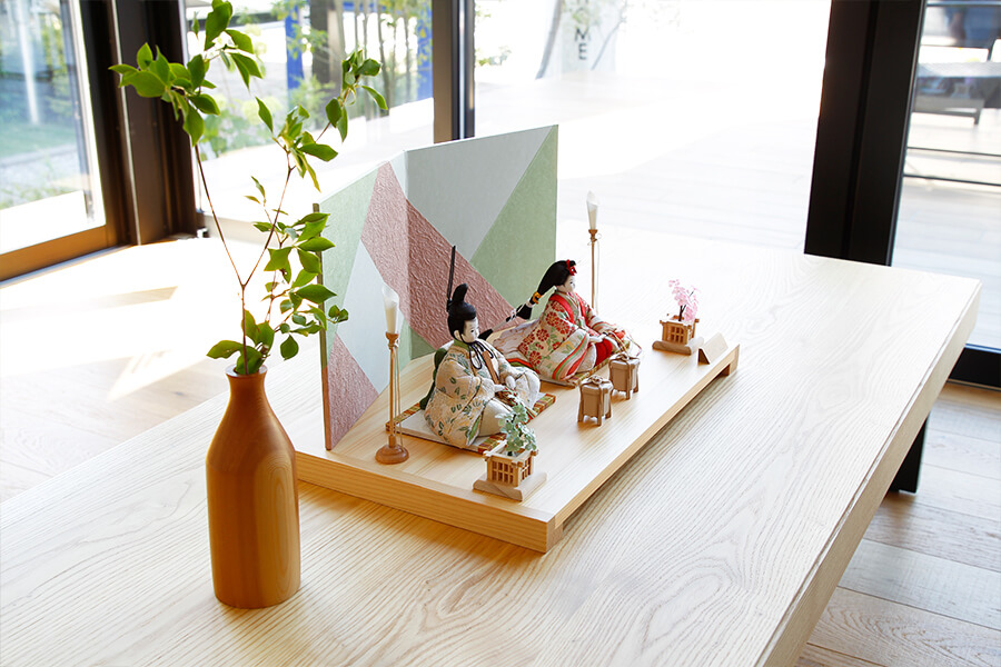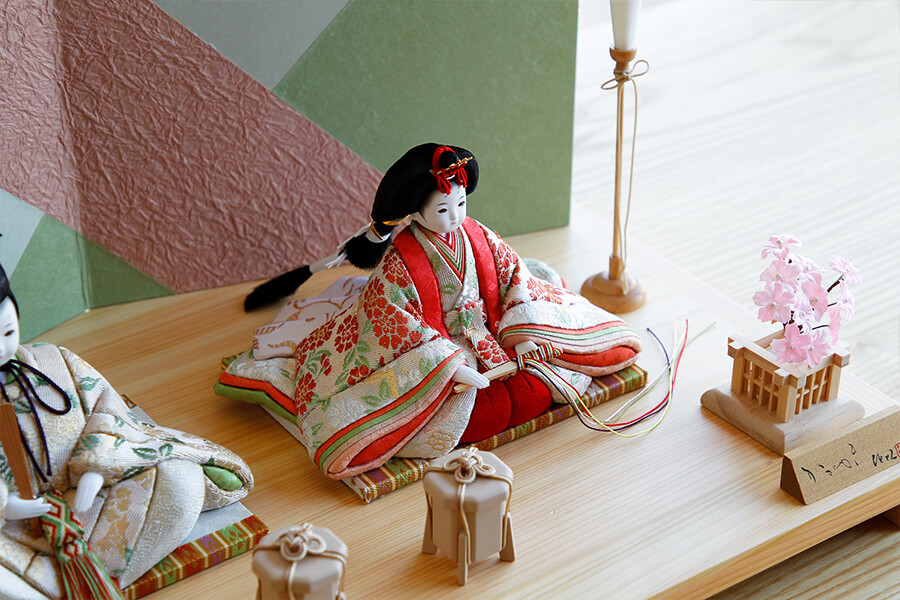 春色のカラーリングを計算された幾何学柄で表現した個性的な和紙屏風には、柔らかな色合いのお雛様がベストマッチです。 - お道具