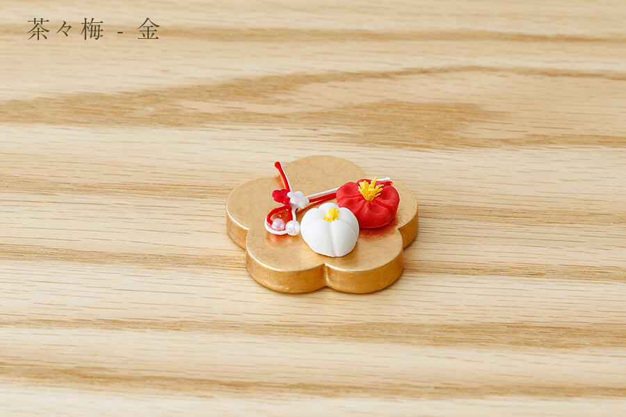 茶々梅 金:梅の花に可愛らしいお菓子をのせた前飾りです。紅白の水引きが桃の節句に花を添えます。 - お花