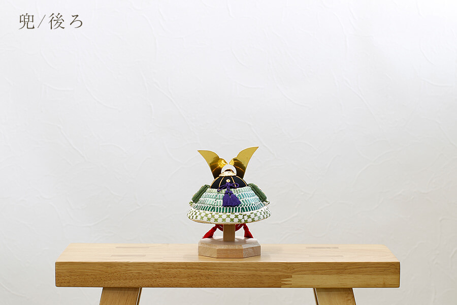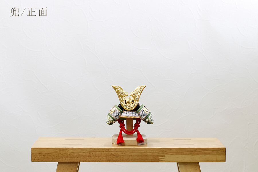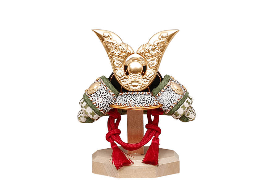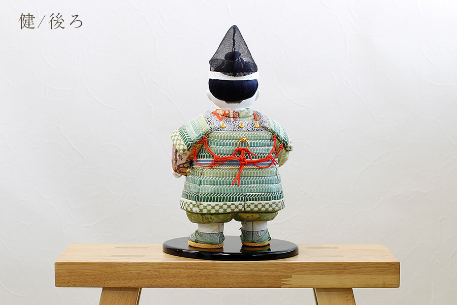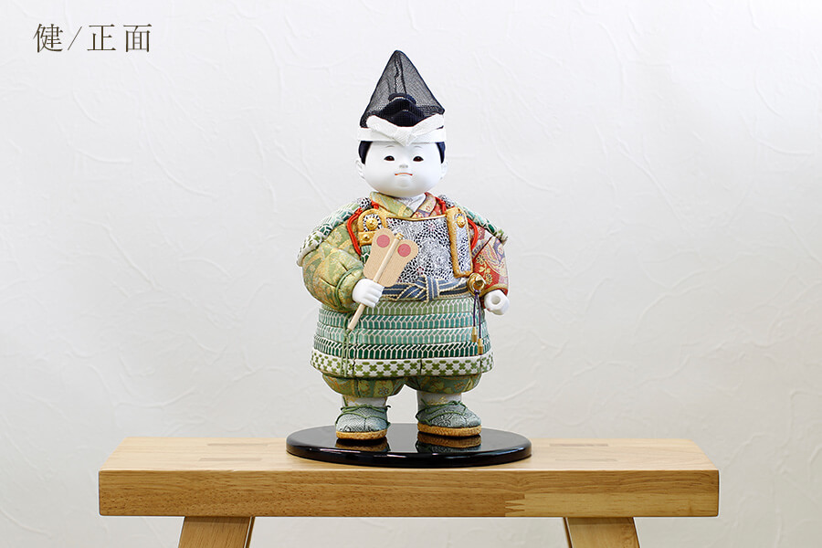 お子さまの健やかなご成長を願う親の気持ちを木目込人形で表現した「ひととえ」の自信作です。さわやかな萌黄の縅。着物は京都西陣織の高級な正絹(シルク100%)を使用しております 。同色で合わせた木目込み兜を脇に飾り、より凛々しく、より勇ましく。
