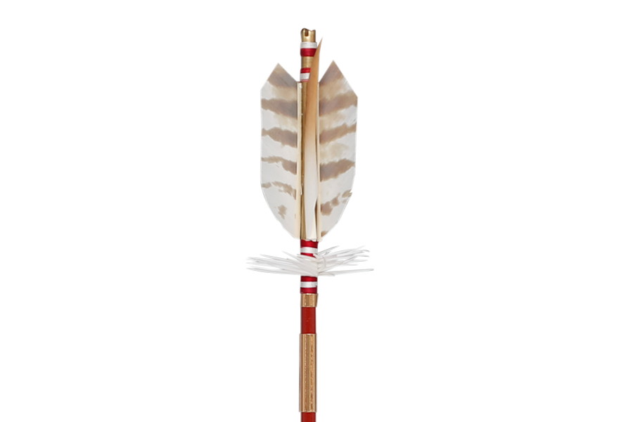 白木球体の土台に魔除けの意味をもつ朱色の弓が刺さったモダンな脇飾りです。お人形や兜を、端午の節句らしく、勇ましく彩ります。五月人形をシンプルに飾りたい方におすすめの脇飾りです。