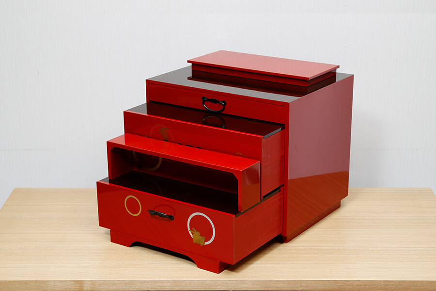 三ツ引収納飾り台:魔よけの色として知られる朱色の独創的な飾り台。会津の漆器職人が丁寧に仕上げました。 収納式の飾り台の引き出しには、お人形やお道具などを収納することが可能です。(お人形の収納用には別途、専用の桐箱が付きます。) - 屏風