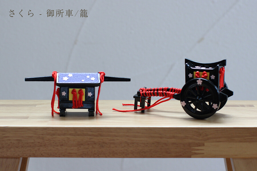 さくら 御所車/籠:婚礼の行列に使われる御所車や籠は、高貴な人々を運ぶための乗り物で嫁入り道具として用意されました。 桜の飾りを散りばめたミニチュアは豪華絢爛な婚礼行列が目に浮かぶようです。 - お花