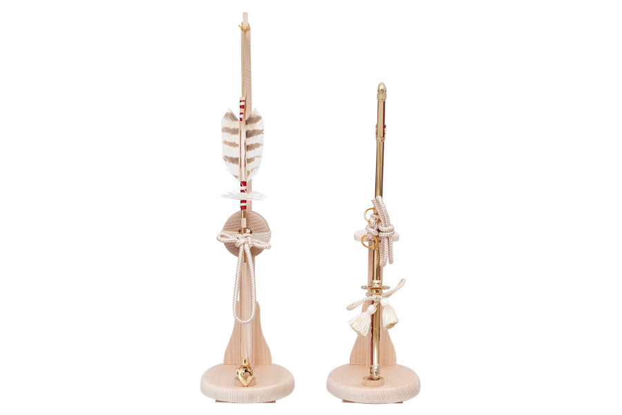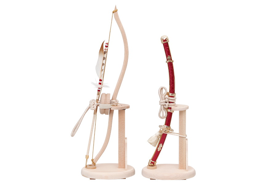 弓太刀は、魔除けのお守りとして古来より節句の飾りに用いられてきました。太刀は鞘を上にして飾ります。これは縁起を担ぐためのもので「武器ではない」ため、抜く必要はないという意味合いがあります。