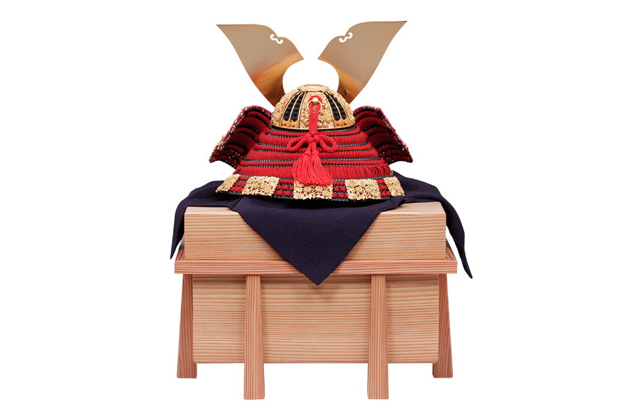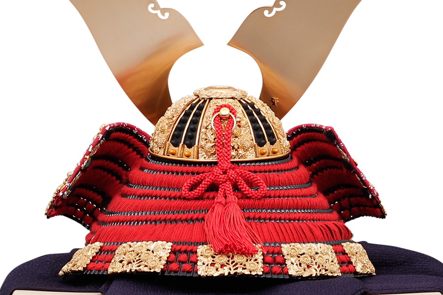 四方白で、地板には枝菊を透かし高彫りとし、天辺の座まで彫金物としています。 金具廻り・菱縫板・吹返しは、すべて枝菊の透かし高彫りで覆ってあり、鍬形台には枝菊に一文字が彫り入れられています。 左右の大袖には、架籬と枝菊に一文字の金物を打ち、これらの彫金物は赤糸の威毛と共に豪華さを表しています。