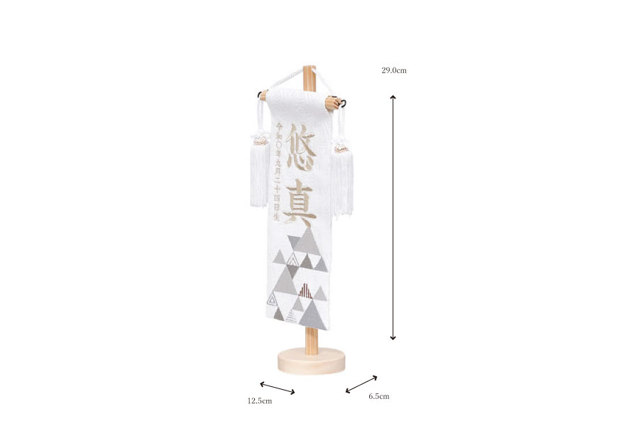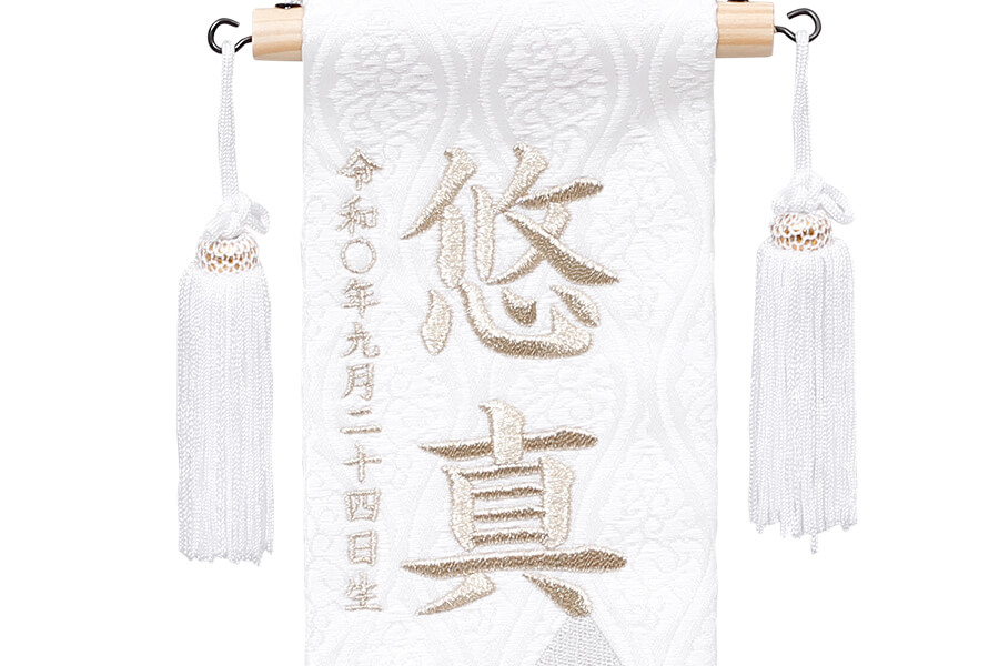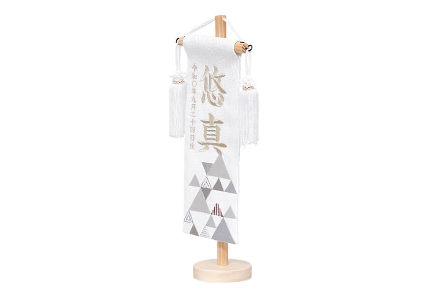 お子様のお名前と生年月日、魔除け・厄除けの意味を持つ「うろこ紋」が刺繍されています。五月人形の隣りに添えて、より豪華に。