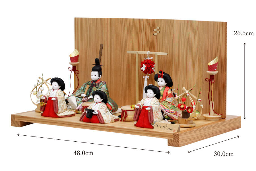 お殿様とお姫様を中心に、三人官女が並ぶ華やかな飾りは、節句をより豊かに演出。木目を活かしたシンプルでナチュラルな背景が、和室はもちろん洋室にも映えるデザインです。