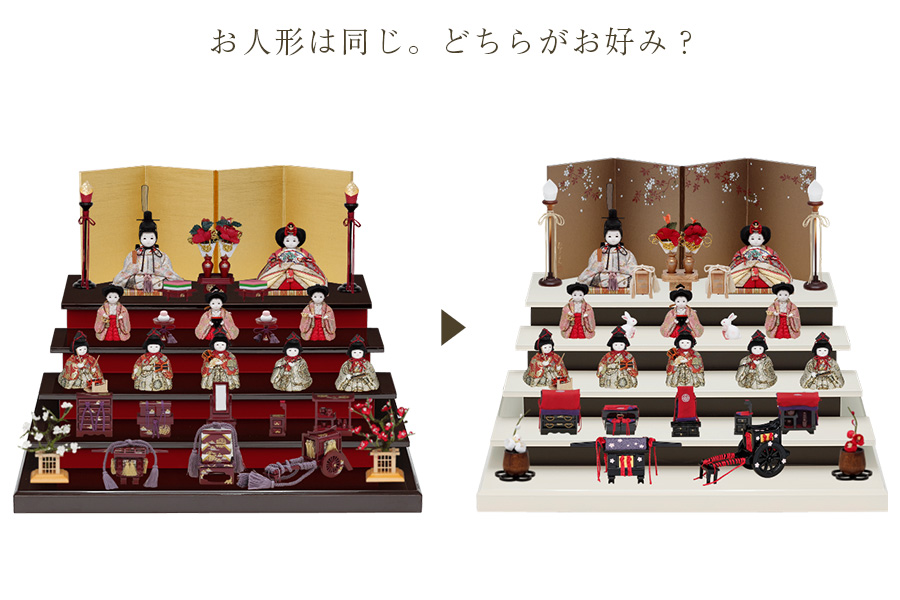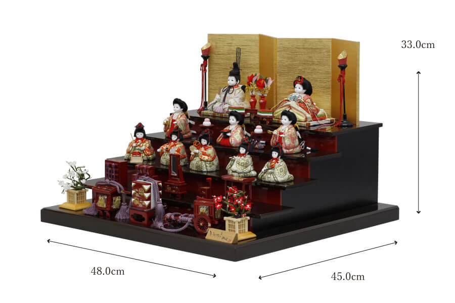 赤と黒を基調とした段飾りに、金屏風と華やかな御道具を合わせ、堂々とした存在感を放ちます。