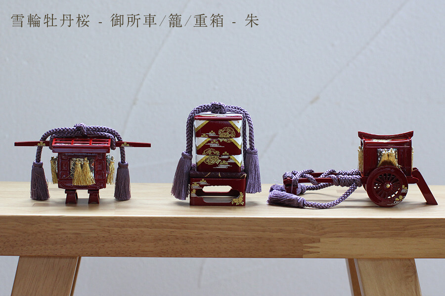 雪輪牡丹桜 御所車・籠・重箱 朱:婚礼の行列に使われる御所車や籠は、高貴な人々を運ぶための乗り物、食べ物を入れる重箱は、嫁入り道具として用意されました。 お道具と同じ雪輪牡丹桜文様を施したミニチュアは豪華絢爛な婚礼行列が目に浮かぶようです。 - お花