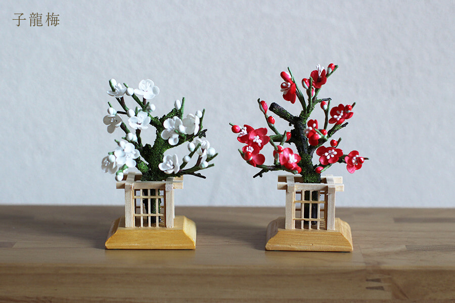 子龍梅:厳しい寒さの中、いち早く春の訪れを告げ良い香りを楽しませてくれる梅は「春告草」とも呼ばれる縁起の良い花です。赤は魔よけの色、白は高貴さを象徴しています。 古くから「歳寒(さいかん)の三友」のひとつに数えられ、日本ではおめでたいことの象徴です。(歳寒の三友…松竹梅) - 桐箱