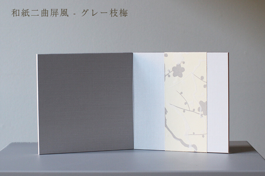 和紙屏風 グレー枝梅:飾り台とのコントラストがスタイリッシュな越前和紙屏風。ゆったりとした二曲の屏風で気品ある佇まいに。 - お道具