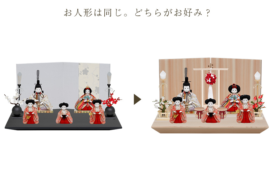 モダンな黒台に、華やかな赤を基調とした五人飾りが映える上質なひな人形セットです。