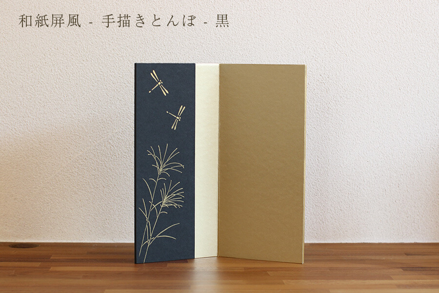 手描きとんぼ 金黒:木の板に和紙を張り合わせ丁寧に仕上げました。職人の手仕事でとんぼを描いています。前にしか飛ぶことができず、後ろに下がることがないとんぼは 『勝ち虫』とされ、武士に縁起の良い模様として使われていました。 - 桐箱