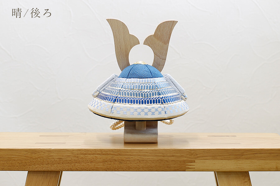 鍬形は天然木。兜の吹き返しには龍村美術織物の金襴をあしらいました。ブルーの濃淡のグラデーションが清々しい木目込み兜です。