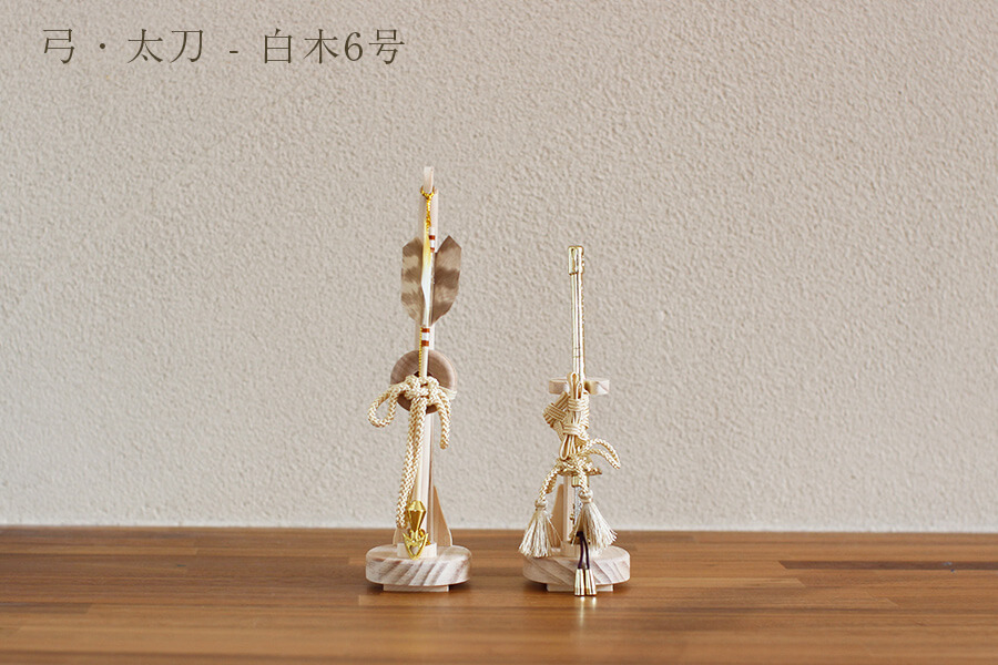 弓太刀 白木6号:弓太刀は魔除けのお守りとして、古来より節句の飾りに用いられてきました。太刀は鞘を上にして飾ります。これは縁起を担ぐためのもので「武器ではない」ため、抜く必要はないという意味があります。