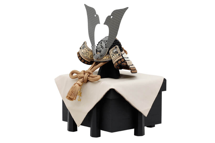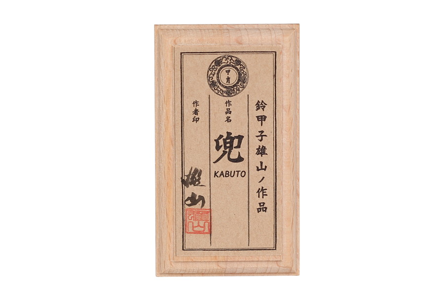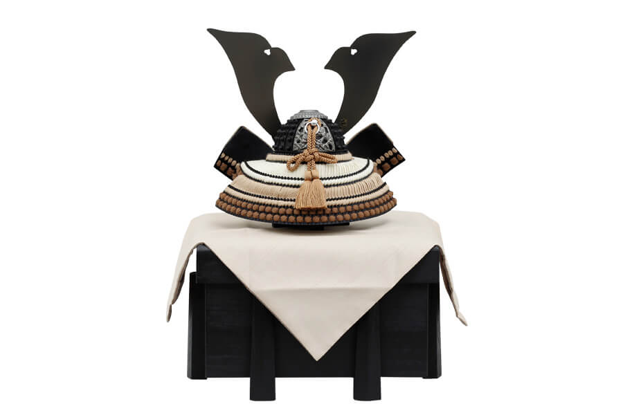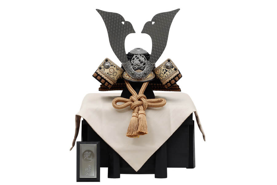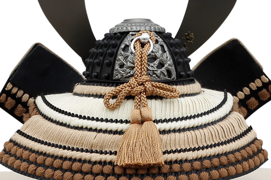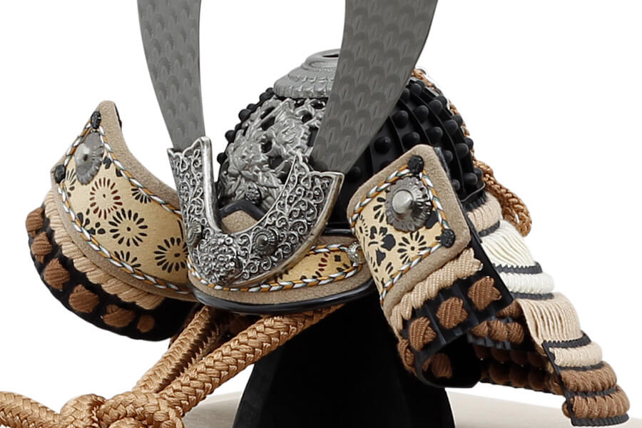 吹き返し、眉庇には、鎌倉時代に流行したと云われる菊籬の絵柄が白い漆で描かれています。金具は全て銀ブロ仕上げで、シックで重厚感のある佇まいが魅力。
