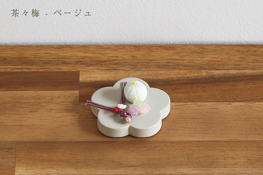 茶々梅 マットベージュ:梅の花に可愛らしいお菓子をのせた前飾りです。紅白の水引きがお祝いに花を添えます。 - お花