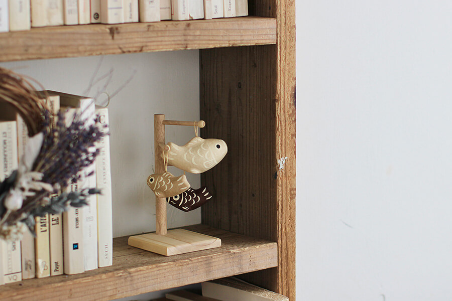 玄関のちょっとしたスペースや飾り棚などおうちのインテリアとして気軽にお飾り頂けるサイズ感です。もちろん五月人形と一緒にお飾り頂くのも素敵です。鯉の飾り部分は張り子、台座は木製となります。