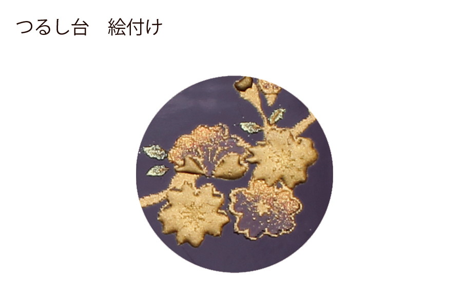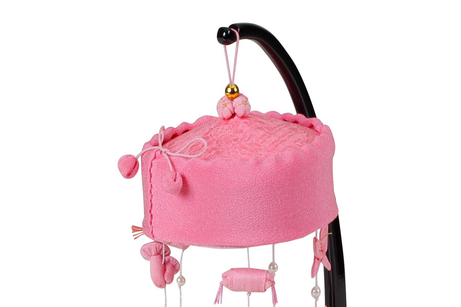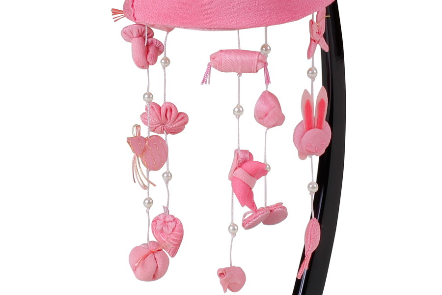 つるしの生地には正絹を使い、天然の染料で草木染めにて、仕上げております。縁起の良いうさぎやひょうたん、お花のかわいいお飾りが上品に揺れます。 溜色の美しい飾り台には金色の蒔絵を施し、従来のつるし飾りよりも高級感のある仕上がりに。
