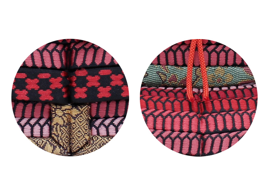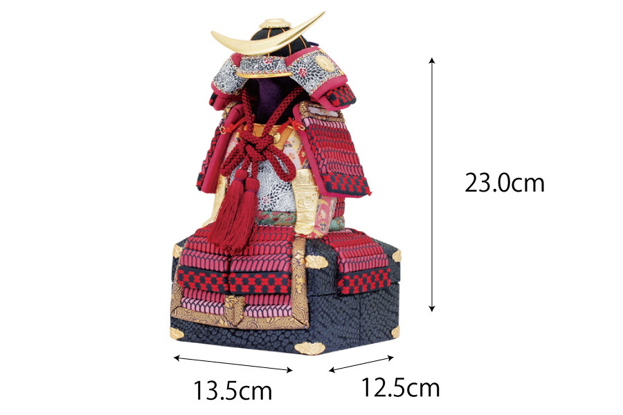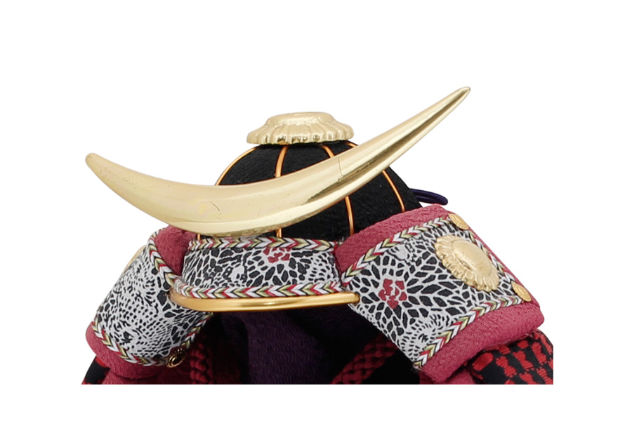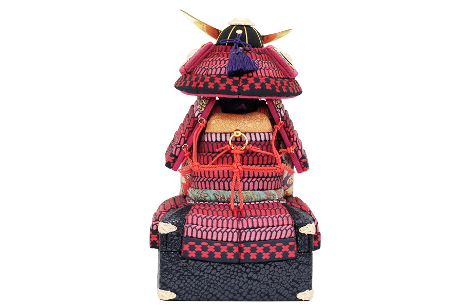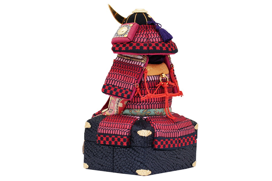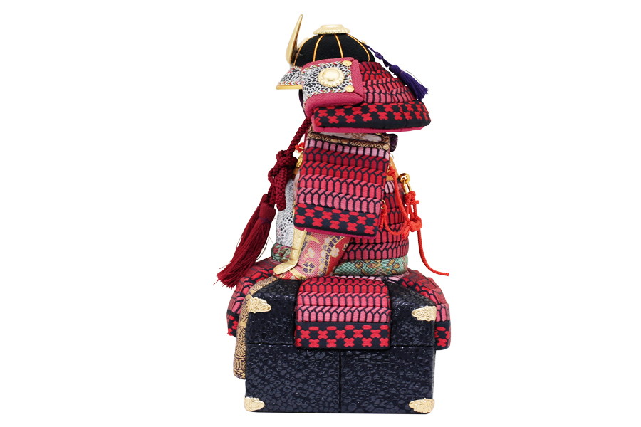 真紅の縅が美しい、インテリアとしても映える仕上がりです。鍬形は純金の箔押しを施してあります。ひととえでは、兜の前飾りをお好みのものにセレクトできます。木目込み鎧はひととえオリジナルの桐箱でお届けいたします。