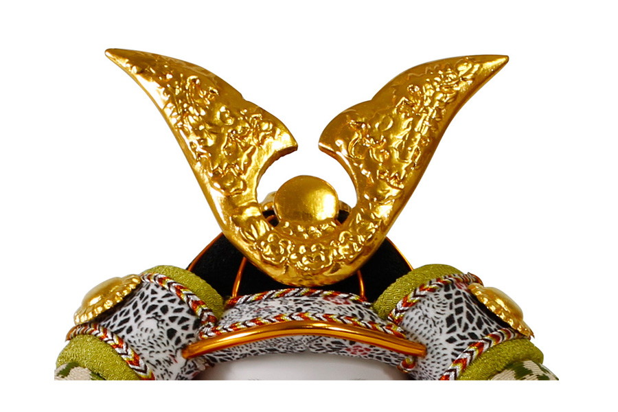 鍬形は純金の箔押しを施してあります。 ひととえでは、兜の前飾りをお好みのものにセレクトできます。