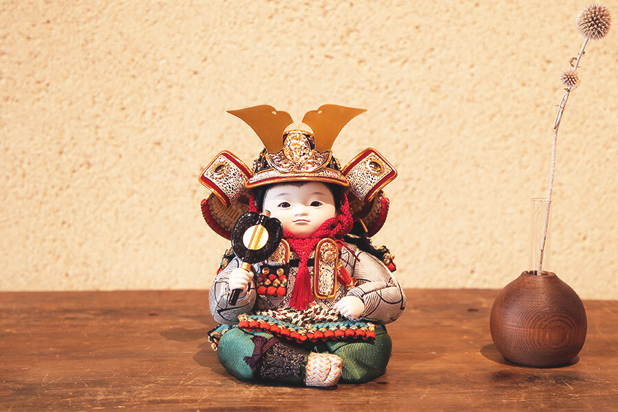 お人形に木目込みで衣裳を施した後に、甲冑を着せつけています。あどけないお顔が愛らしい鎧着童大将(立ち・座り)と、凛とした表情が勇ましい鎧着武者大将(座り)をご用意しました。