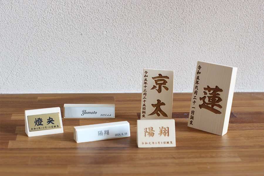 名前札は、小・中・大の3サイズ。小サイズは木彫りと金プレートの2種類をご用意しました。お人形や兜の大きさに合わせて選べます。