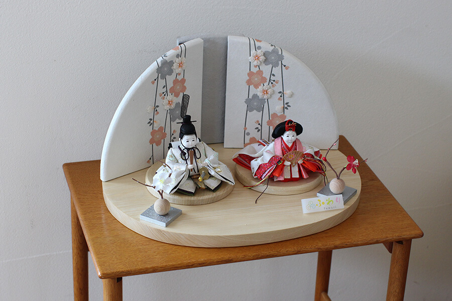 ふわりシリーズ衣裳着雛人形の丸台飾りは、とってもコンパクト。