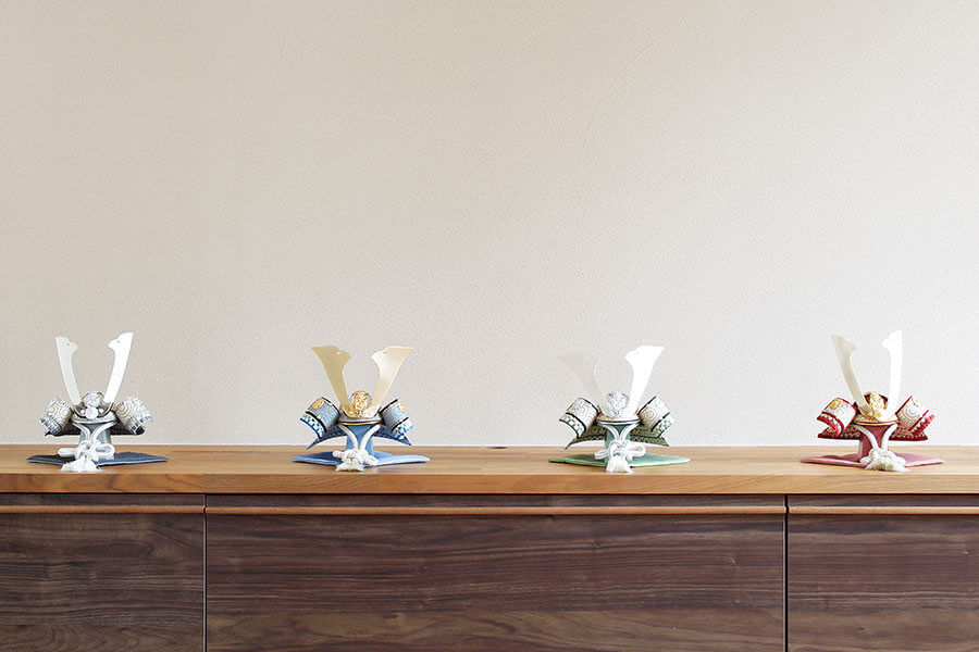 コンパクトな兜は全4色。衝立飾りと収納飾りの2種類をご用意しました。どちらもとてもコンパクトに収納する事が出来ます。