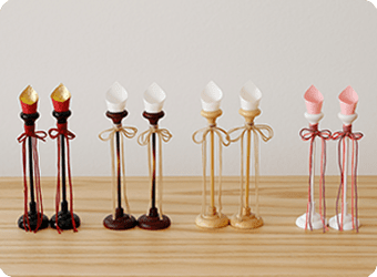 お屏風の手前、左右に飾られている燭台です。木目込み人形には油灯をお飾りしています。