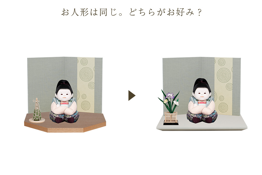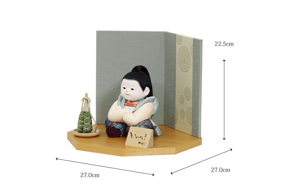 衣裳は、創業300年を超える京都の老舗に色目や絡みを指定し、厳選した正絹(シルク100%)を着せつけています。 髪の毛には絹糸を使用しているため、コシがあり、上品な艶やかさがあります。 - 飾り台