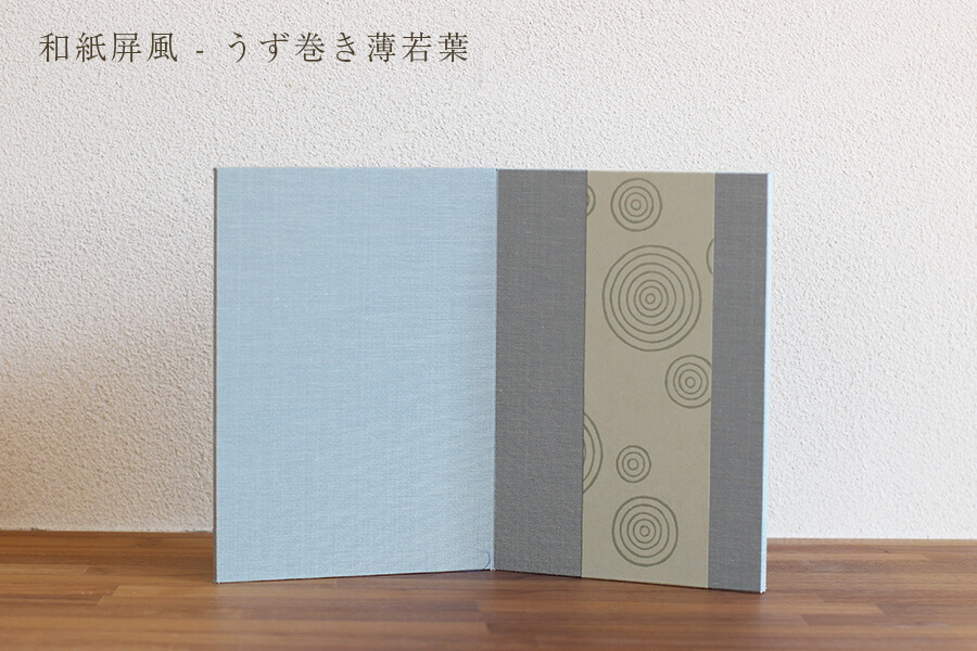 うず巻き薄若葉:木の板に布を張り合わせ丁寧に仕上げました。アクセントの和紙の帯には『幸運を巻き取る』と云われる渦巻をイメージした文様をあしらいました。 - お道具