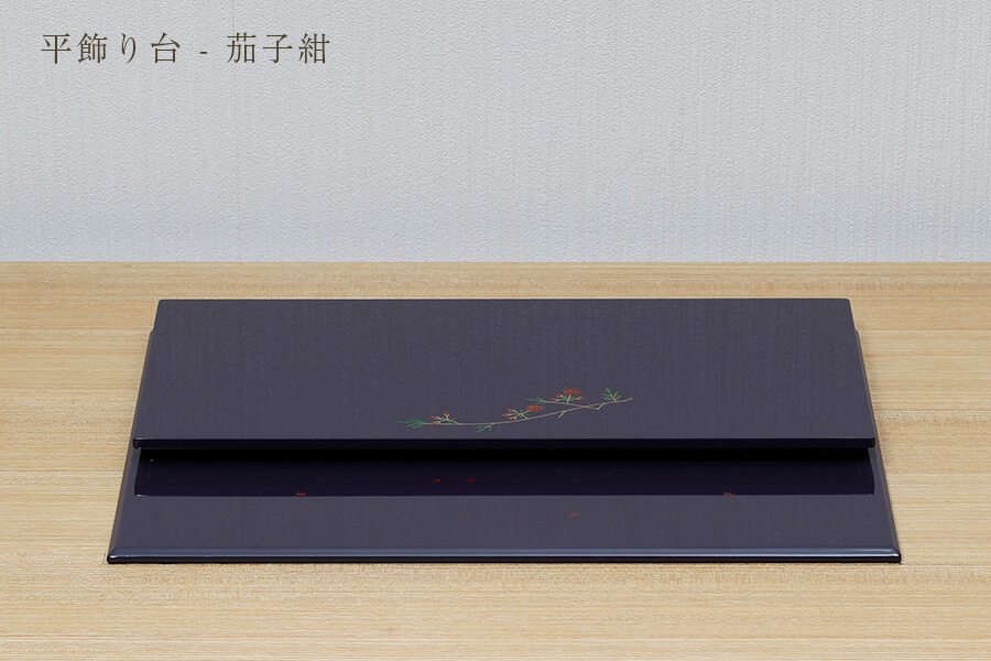 平二段飾り台:品の良い茄子紺色の飾り台。会津の漆器職人が丁寧に仕上げました。手描きの蒔絵がお祝いに花を添えます。
