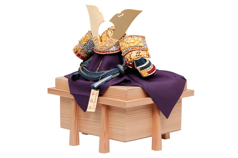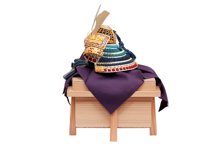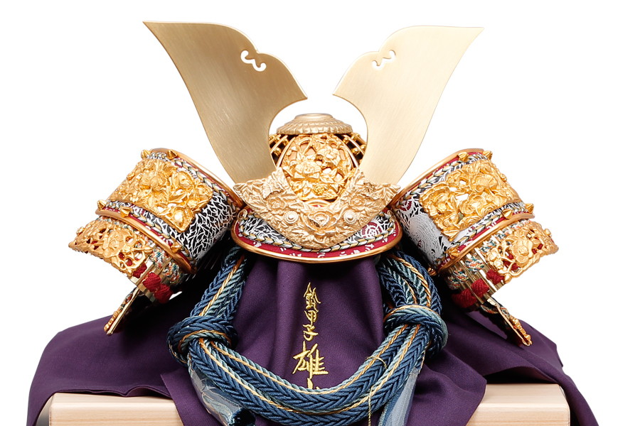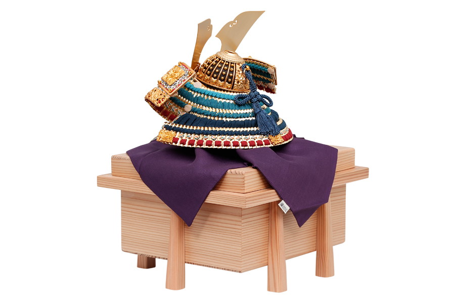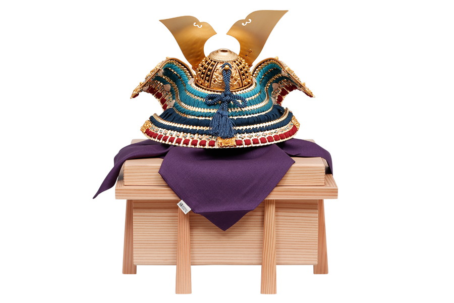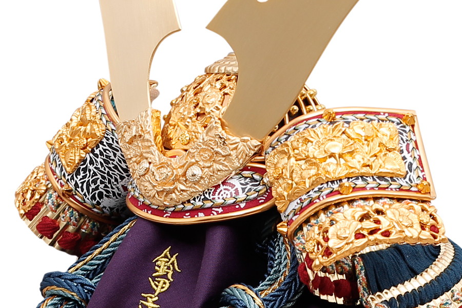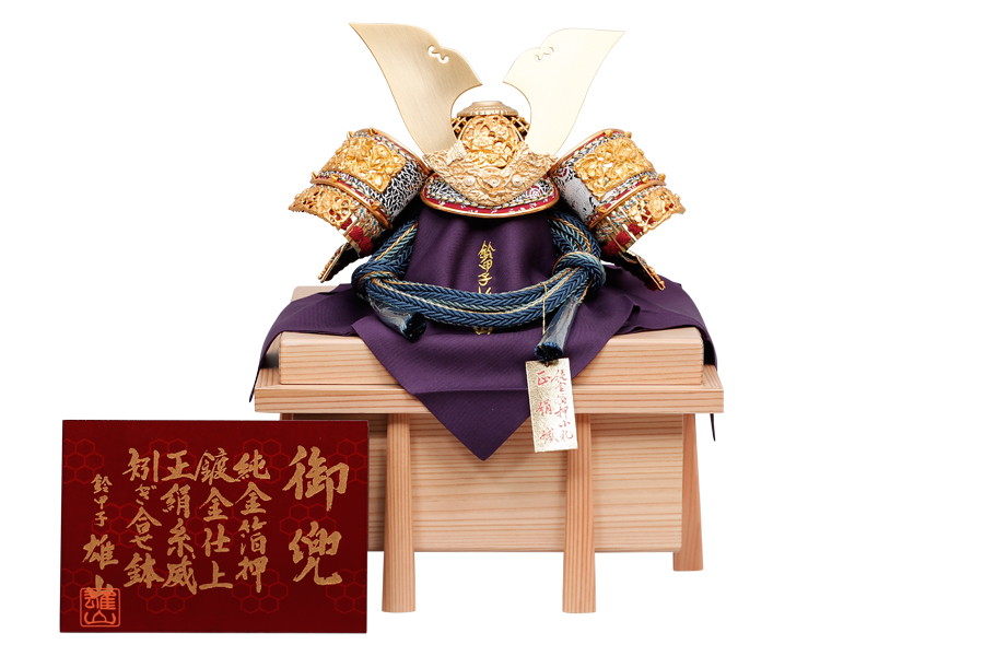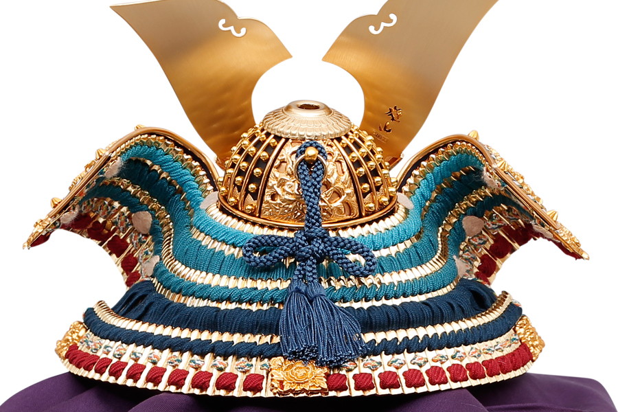 名工鈴甲子雄山により、細部まで精巧につくられた兜飾りです。緻密な細工の飾り金具に、金沢の純金箔を贅沢にほどこしました。正絹を使った縹色裾濃威のグラデーションが見事。高級感あふれる兜飾りが、輝きに満ちたお子さまの未来を照らします。