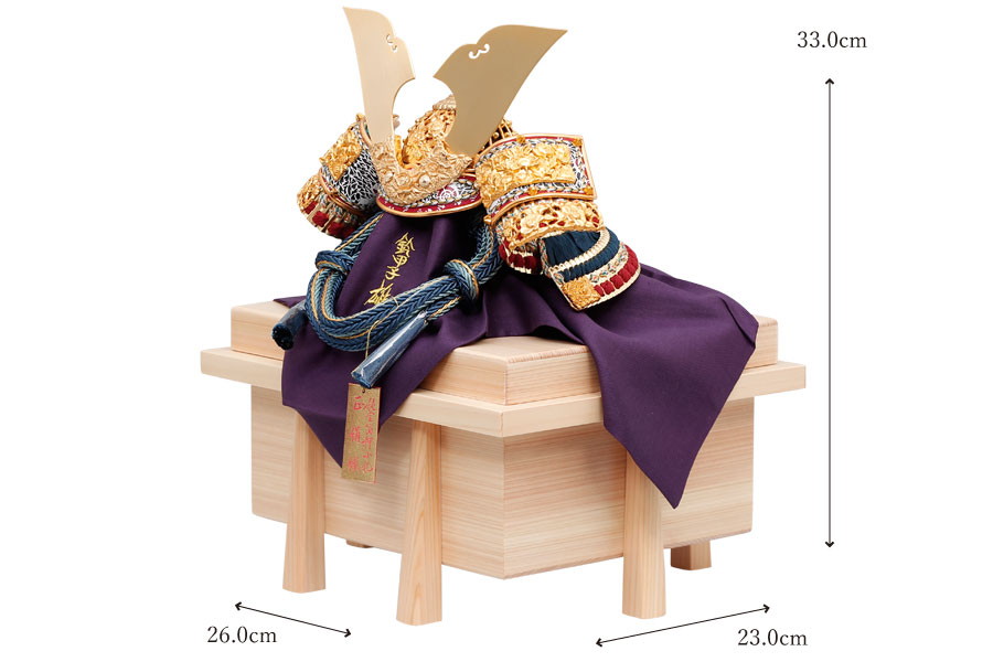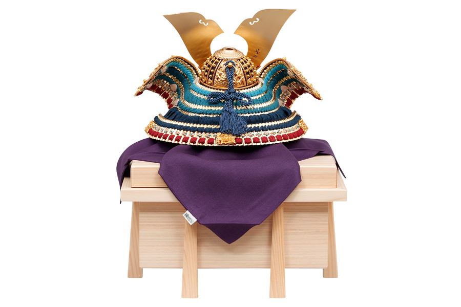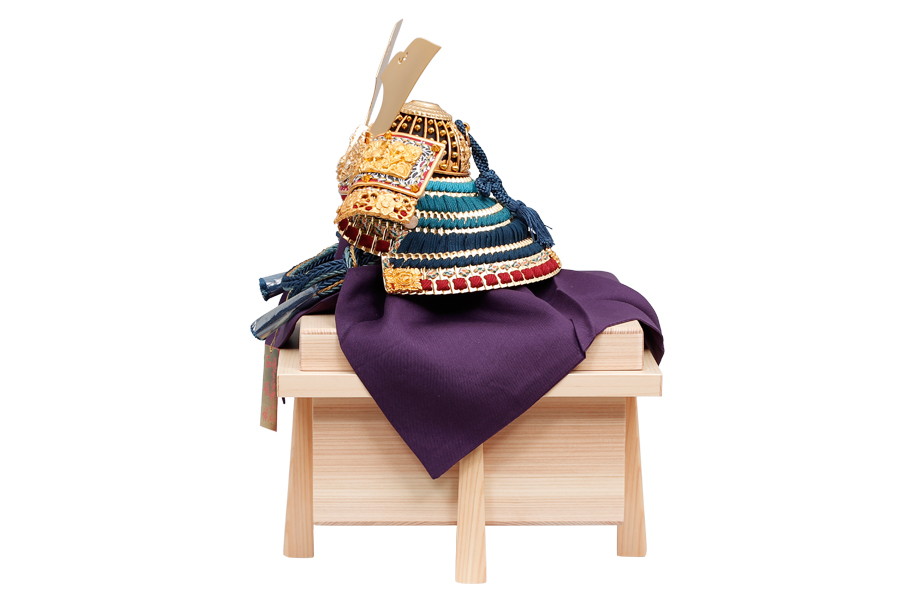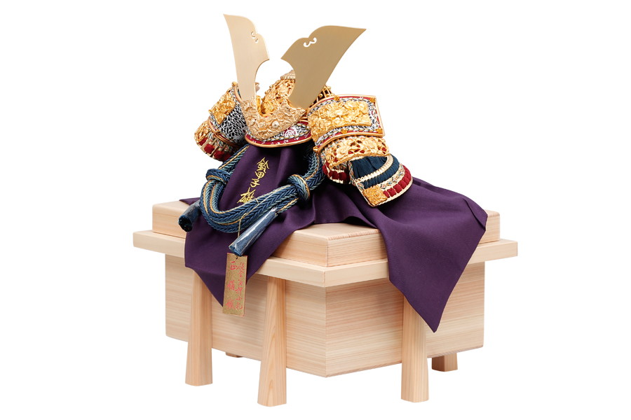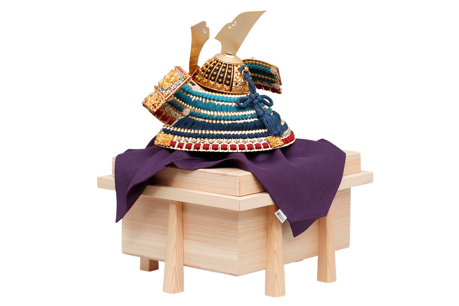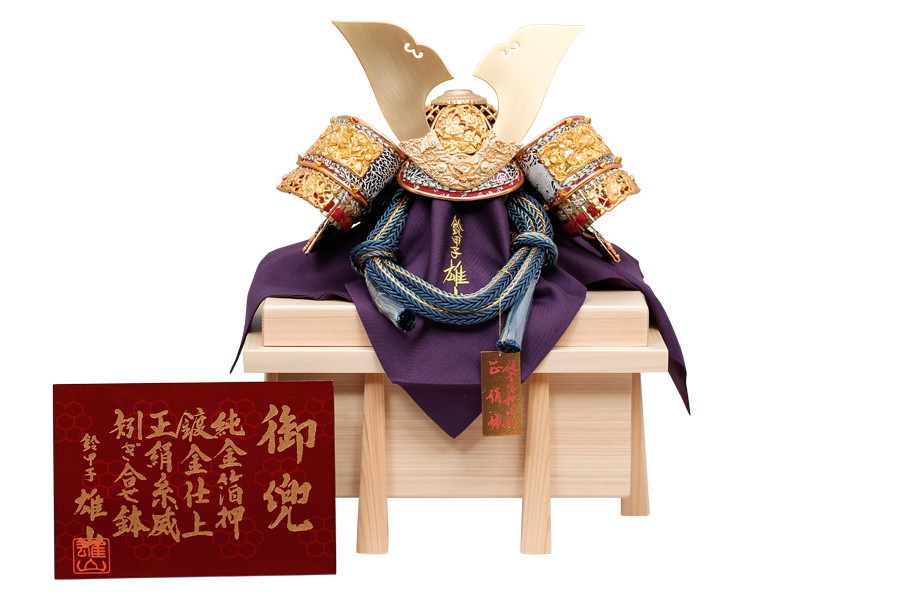 名工鈴甲子雄山により、細部まで精巧につくられた兜飾りです。緻密な細工の飾り金具に、金沢の純金箔を贅沢にほどこしました。正絹を使った縹色裾濃威のグラデーションが見事。高級感あふれる兜飾りが、輝きに満ちたお子さまの未来を照らします。