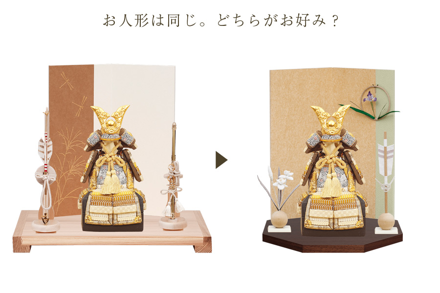 鍬形は純金箔押し。V型、三日月、お好みの鍬形をセレクトできます。伝統の技と現代の感性が融合した新感覚の鎧飾りです。天竜杉の飾り台で風格を添えて。